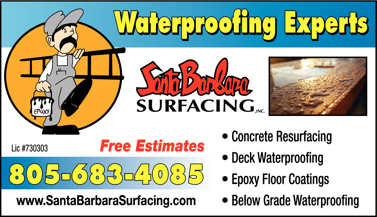 Santa Barbara Surfacing is Santa Barbara County's source for specialty coatings. We provide expert waterproofing for decks, concrete, fountains, and below-grade. We also provide epoxy floor and wall coatings, concrete polishing, concrete staining, and roofing. Our employees are trained by the manufacturers and are experts in each of the services they provide. Call us today! You can rest assured that your job will be done right by a top professional in the field.