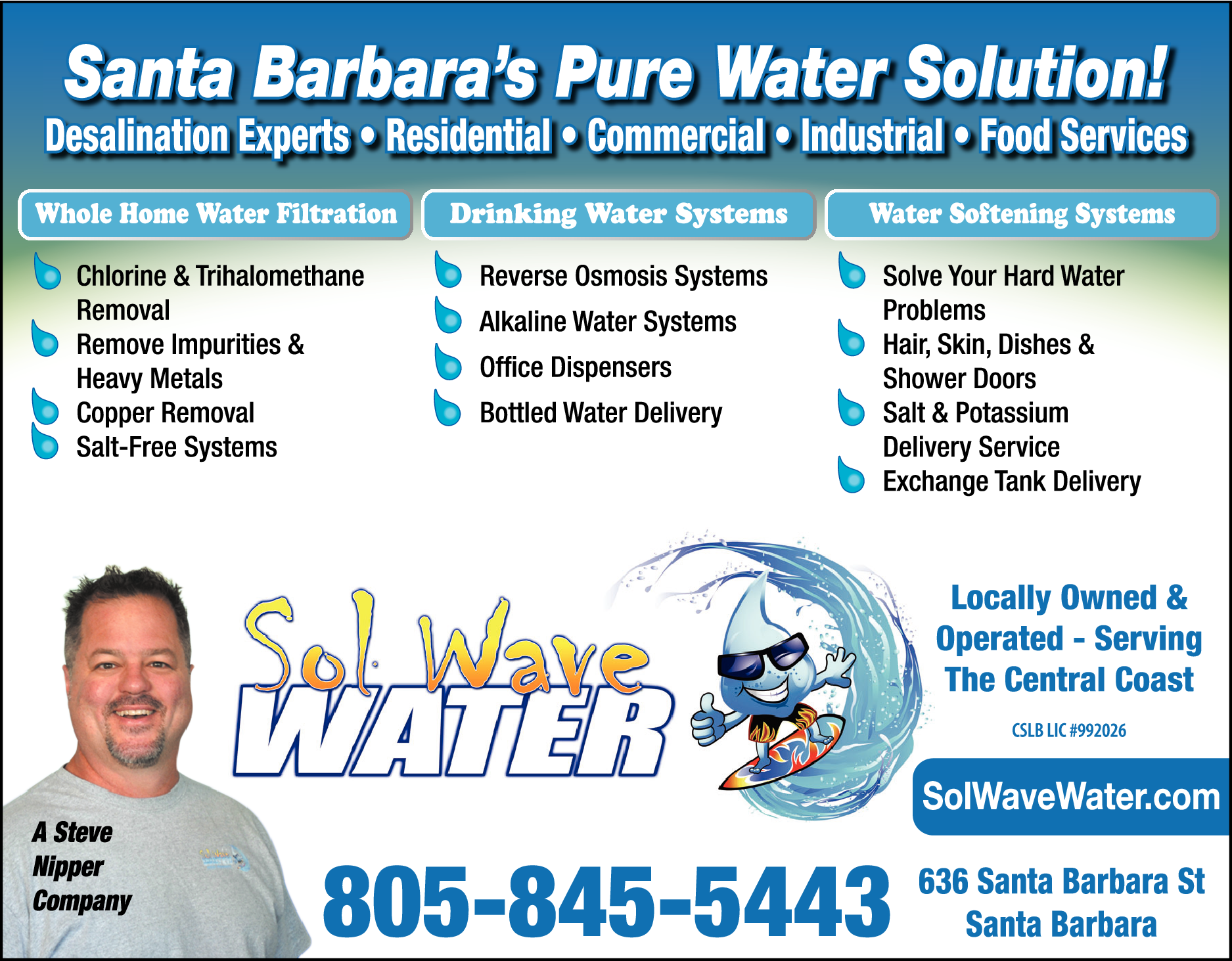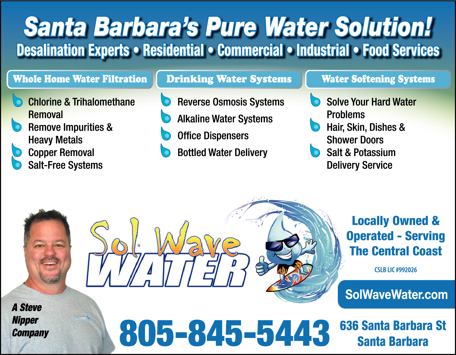 Sol Wave Water is Santa Barbara County's pure water solution! Whether you already own equipment or need something new, our mission is to provide you with the best solutions for all your hydration needs and make your California water perfect! We offer whole home filtration, drinking water systems as well as water bottle delivery, and water softening systems available for rental or purchase. We also offer salt & potassium delivery services for your soft water systems as well as provide maintenance service calls to keep those systems running smoothly. Call us today and experience the exceptional value and our outstanding customer service.
