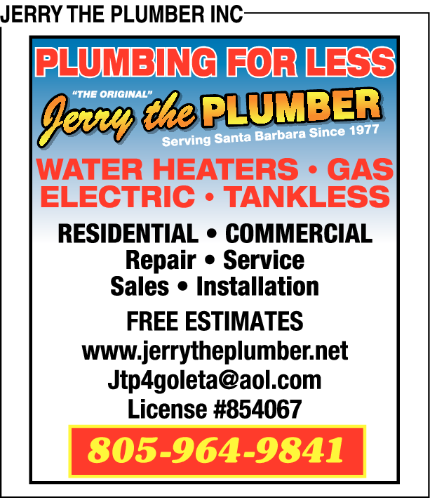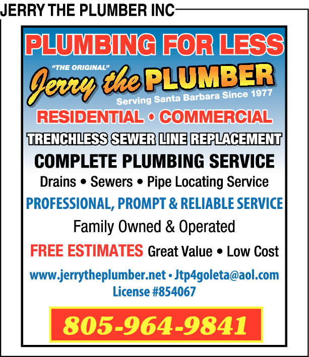 Names and Numbers Verified Plumbers Drain & Sewer Cleaning Sewer Contractors Sewer & Drain CleaningJerry The Plumber is a local, family owned Santa Barbara county contractor. We are happy to serve the cities of Santa Barbara, Goleta, Carpinteria, Montecito, Summerland, Lompoc, Santa Ynez, and the Gaviota community since 1974. We are proud to say that customer service is our #…
