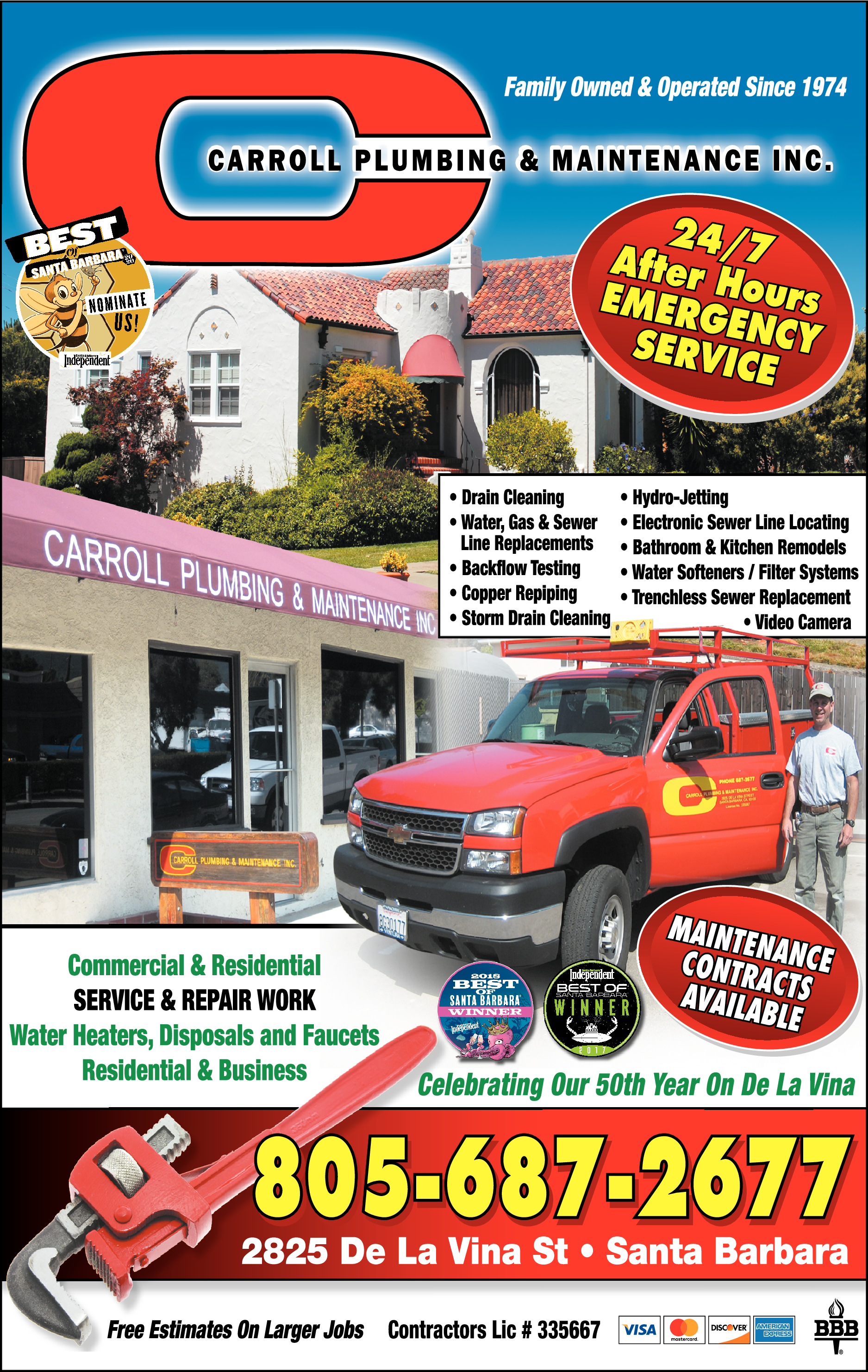 Names and Numbers Verified Plumbers Drain & Sewer Cleaning Water Heater Installation & Repair PLUMBING - DRAIN & SEWER CLEANING DONT USECarroll Plumbing & Maintenance has been serving the residents and businesses of Santa Barbara since 1974! Our pride of ownership shows with our quality workmanship and superior customer service. Whether your job is commercial or residential, big or small, you can count on Carrol…