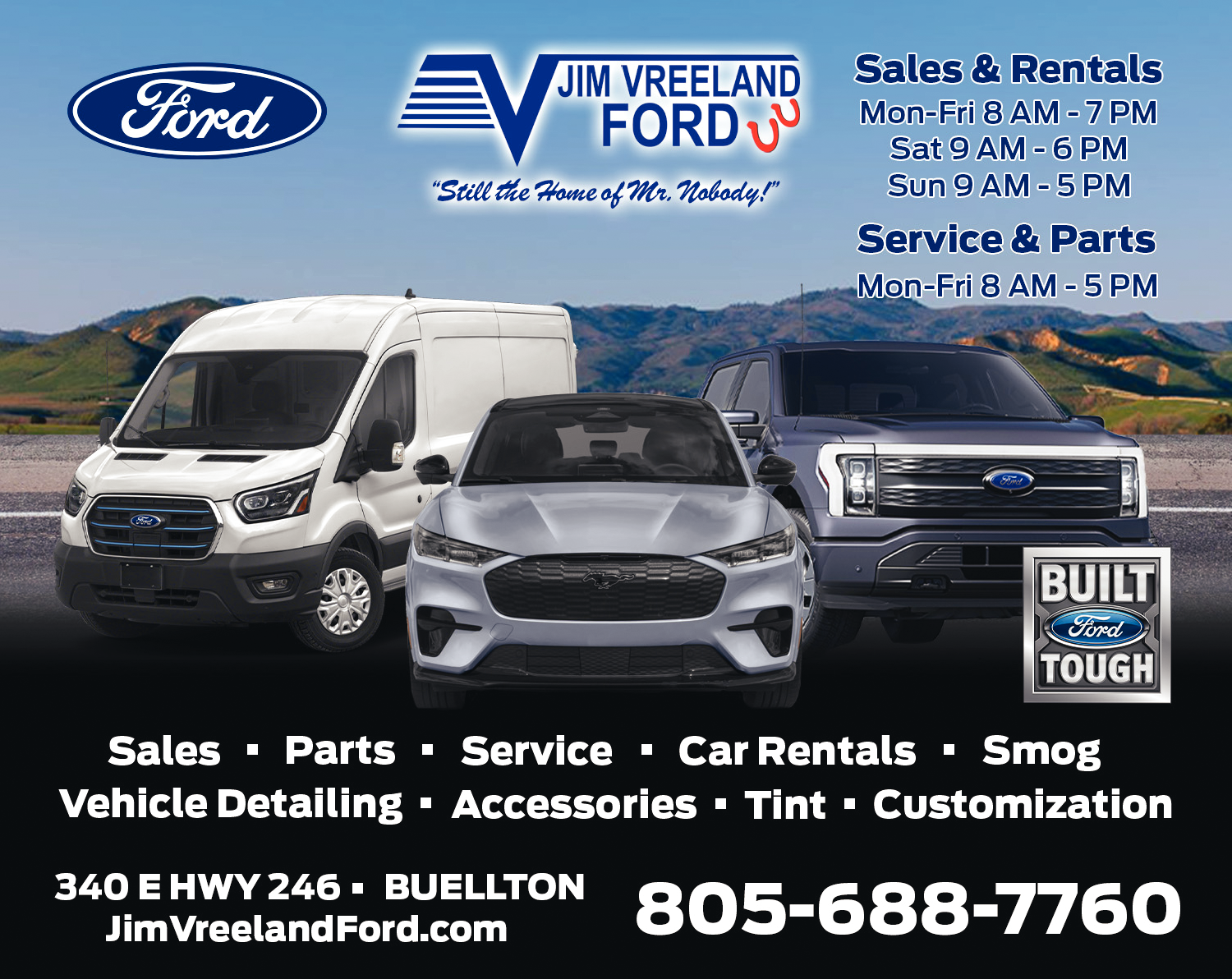 Names and Numbers Verified Automobile Dealers - New Automobile Dealers - Used Auto Parts & Accessories Automobile Repair & ServiceJim Vreeland Ford Rentals offers a fleet of newer SUVs & trucks to accommodate any need or party-size. Enjoy 24-hour pick-up, unlimited mileage, and same-day bookings coupled with unmatched service and affordable prices."