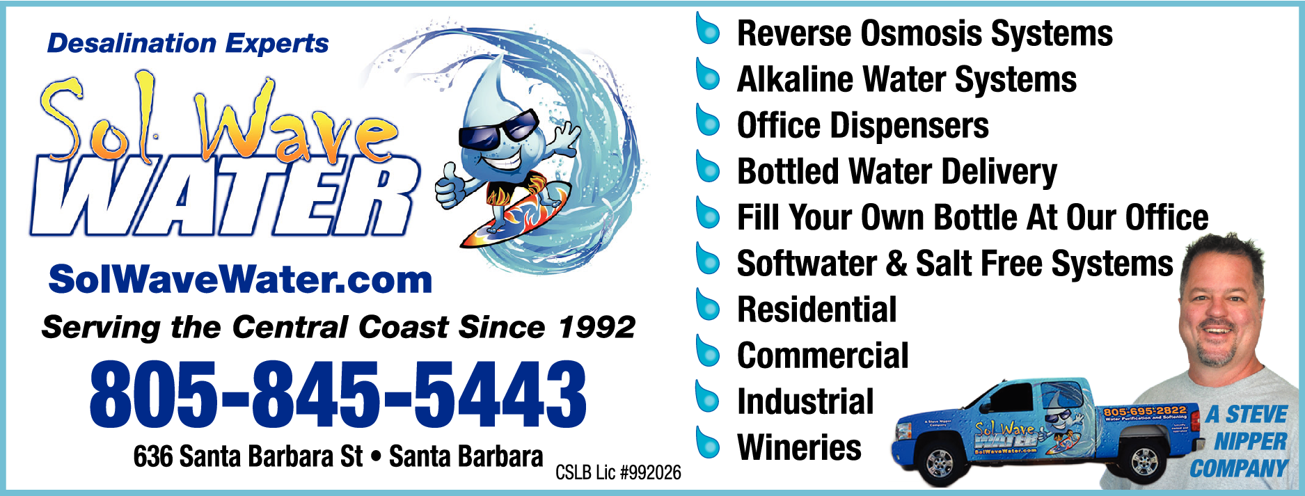 Names and Numbers Verified Water Companies - Bottled Water Consultants Water Conditioning Equipment Service & Supplies Water Softening & Conditioning RentalsSol Wave Water is Santa Barbara County's pure water solution! Whether you already own equipment or need something new, our mission is to provide you with the best solutions for all your hydration needs and make your California water perfect! We offer whole home filtration, drink…