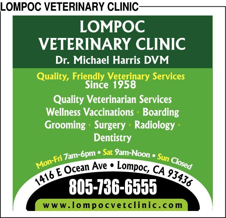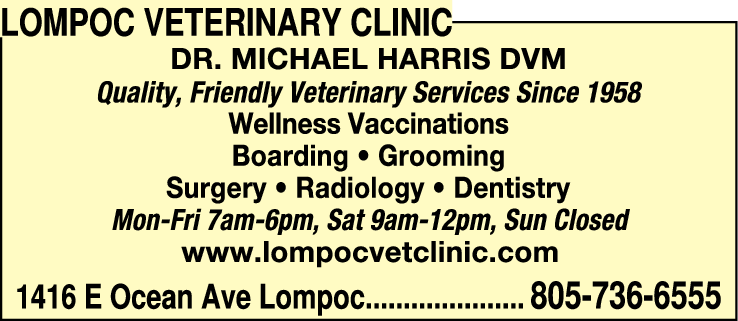 Names and Numbers Verified Animal Hospitals Kennels Kennels & Pet Boarding Pet Grooming Services & SuppliesDr. Harris and the Lompoc Veterinary Clinic has been your trusted source for veterinary services in the Lompoc community since 1996. Our services include medical services, radiology, surgery, dentistry, boarding, and grooming. We are also the only local clinic that welcomes ex…